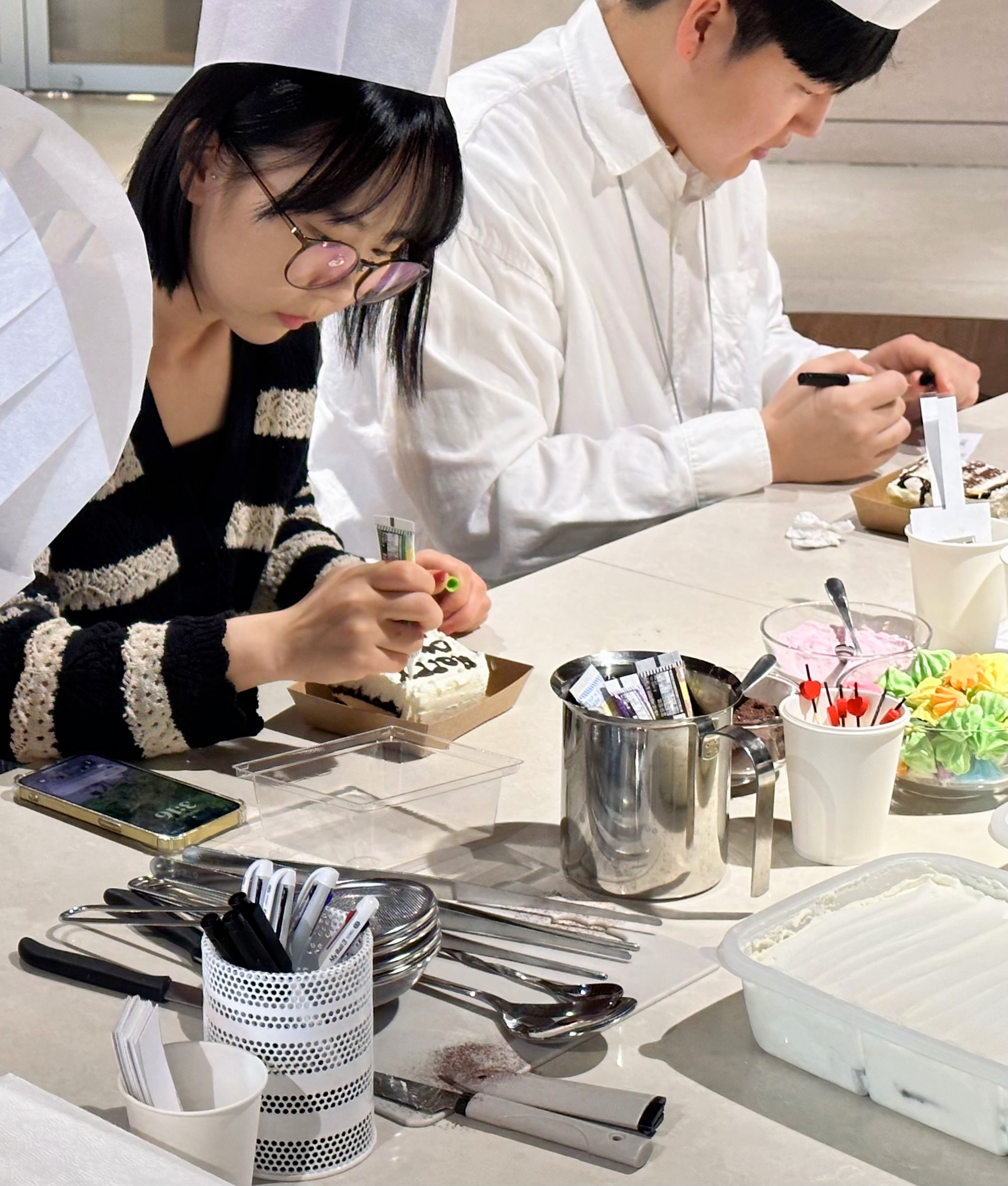 짧은 시간 체험하는 파티셰지만 사진은 제대로 찍어야죠! 준비한 조리사 모자도 잘 써주셔서 더 재미있게 진행할 수 있었습니다. 모두 집중해서 케이크를 꾸미는 모습도 전문 파티셰 못지않았습니다.