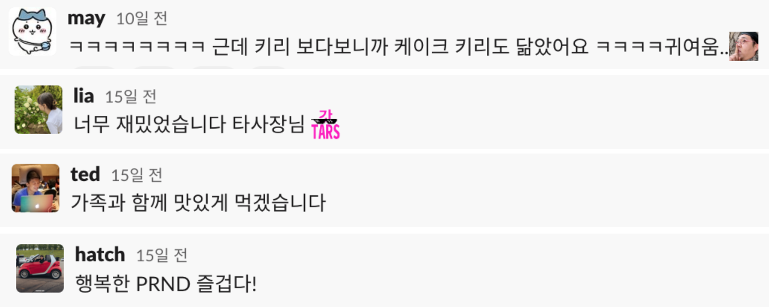 이번 따레쥬르 이벤트가 어땠는지 구성원의 반응을 알아보기 위해, 고객커뮤니케이션팀의 @bella와 짧은 인터뷰를 진행했습니다. 솔직한 후기는 바로 아래에서 확인하실 수 있습니다.
