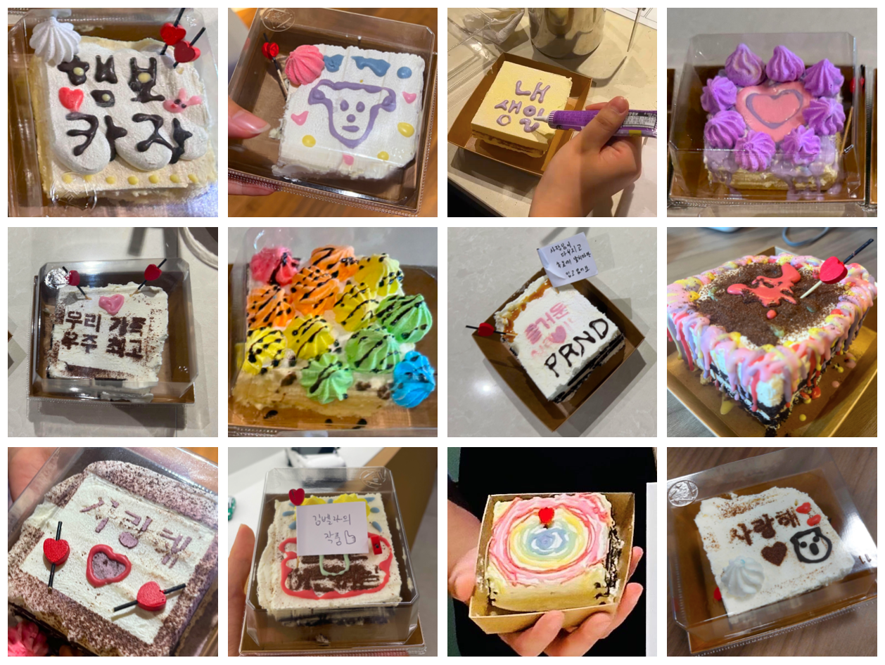 다른 분들의 케이크도 한 번에 모아봤습니다. 꾸며진 케이크들이 형형색색 예쁩니다 😄 우리가 열심히 꾸민 케이크라서 더 의미 있는 맛이 아니었을까요!