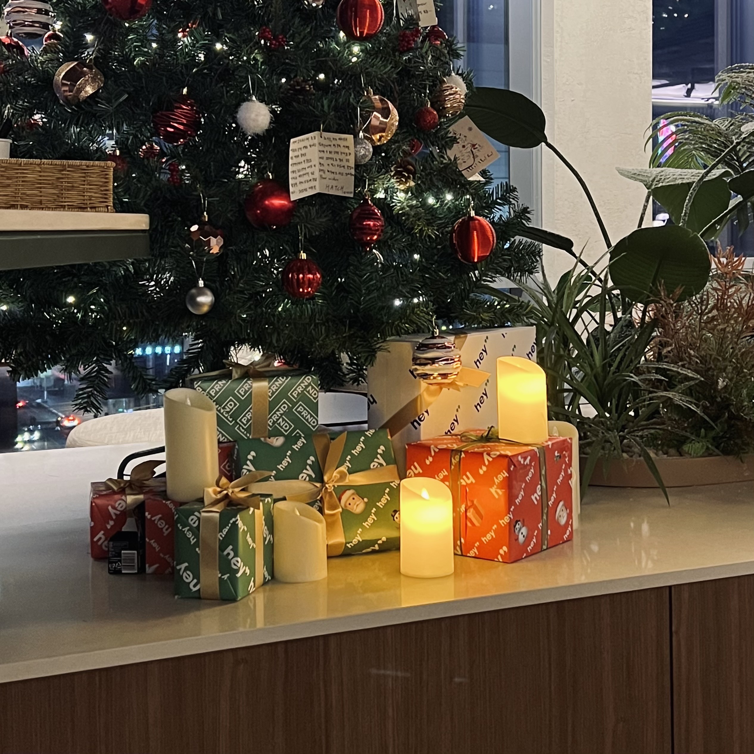 이번 첫 시즌 데코 컨셉은 '크리스마스' 였습니다. 연말에도 열심히 일하는 헤이딜러 구성원들을 위해 산타가 잠시 다녀간 것 같은 흔적을 선물해주고 싶었어요.