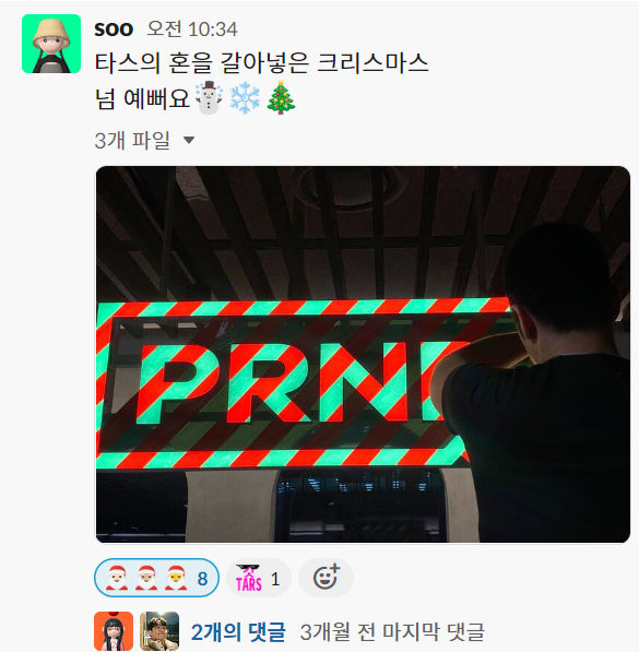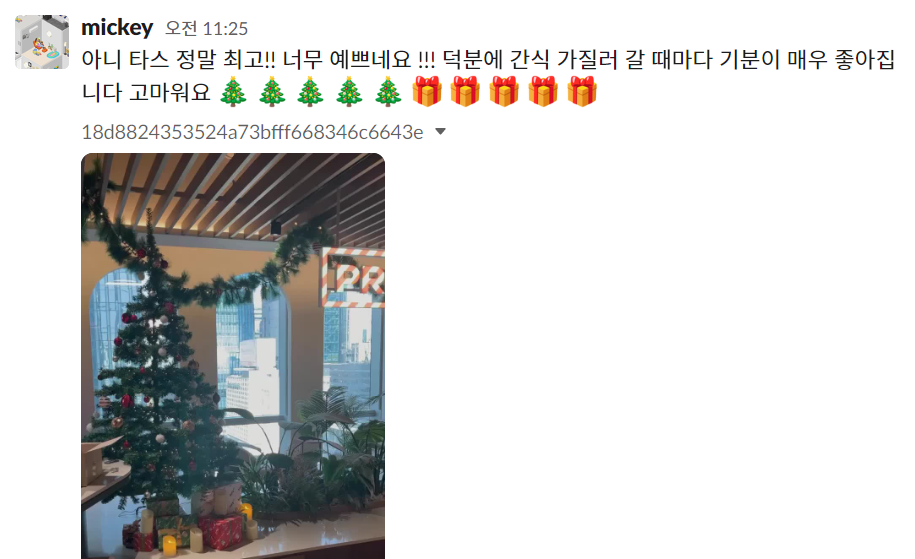 크리스마스 시즌 데코가 시작되자마자, 슬랙 채널에서 열기가 대단했습니다. 🔥 앞으로도 꾸준히 좋은 직원경험 제공할 수 있도록 노력하겠습니다. 타스도 정말 고생 많으셨습니다!