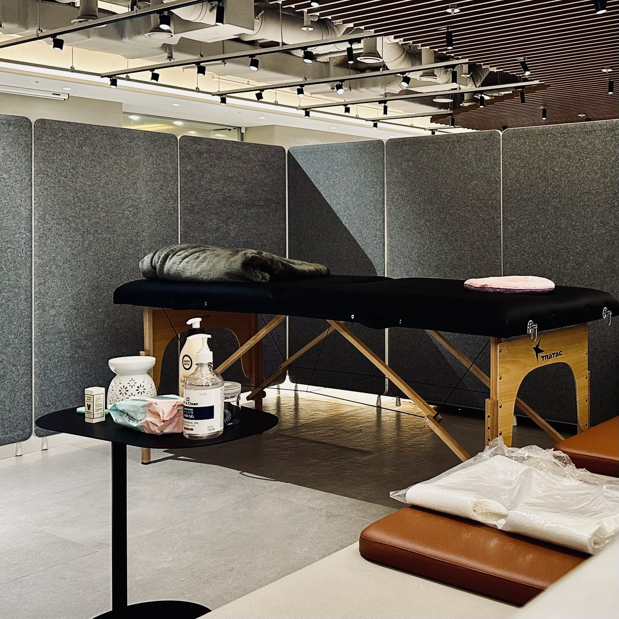누워서 받는 바디 테라피를 개방된 공간에서 진행하기는 무리가 있다 보니, 라운지 한편에 파티션을 세워 시선이 차단된 공간을 마련했습니다. 전문 테라피스트 선생님들이 마사지 베드와 향초, 잔잔한 음악이 나오는 블루투스 스피커까지 준비해 오셔서, 실제로 마사지 샵을 이용하는 기분이 들었습니다.