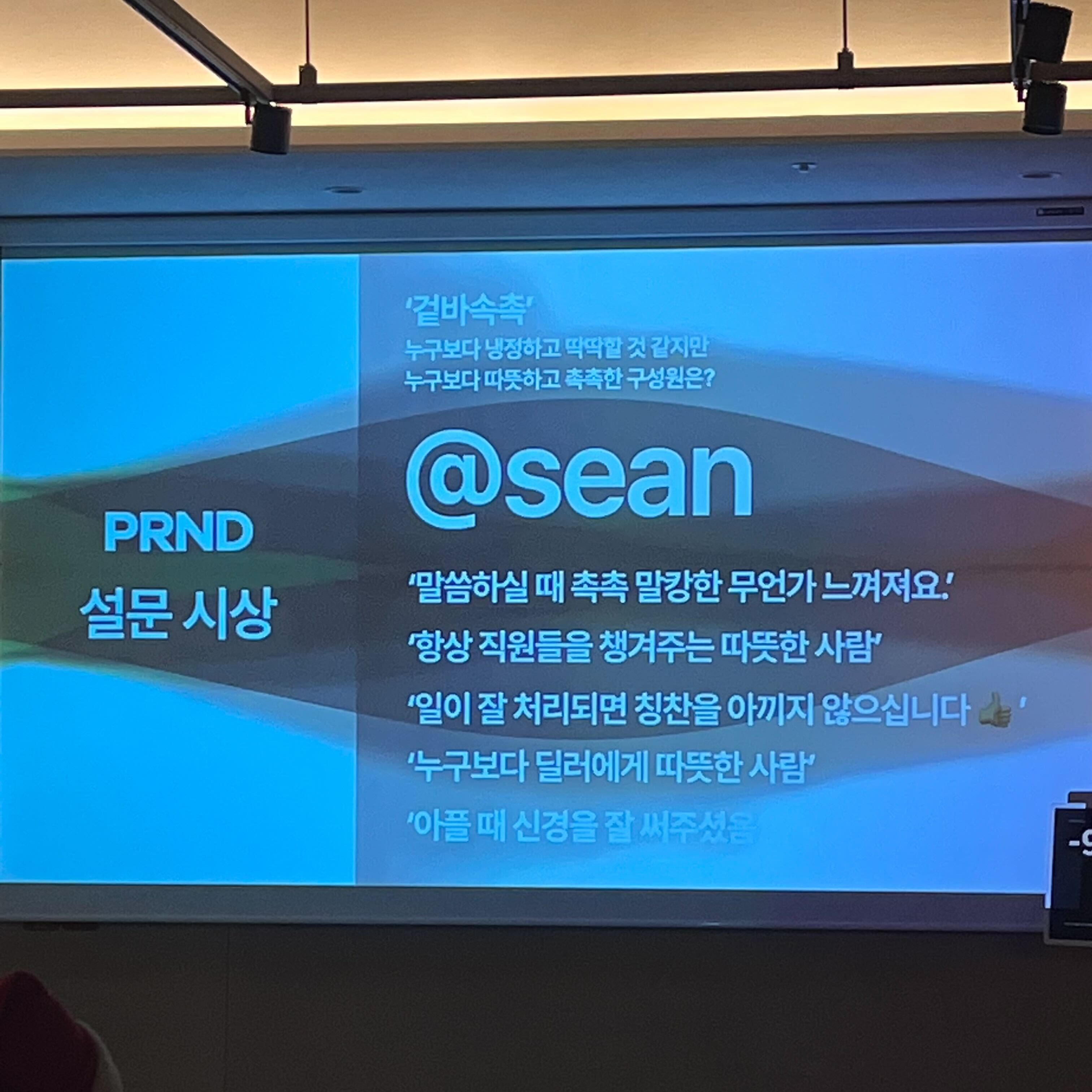 다음은 헤이딜러 구성원들이 직접 투표를 해 수상자가 선정되는 'PRND 설문 시상'입니다. 사진은 8개 수상 부문 중 '겉은 무뚝뚝해도 속은 촉촉한 구성원'에게 주어지는 '겉바속촉' 상인데요, 수상자는 바로 서비스관리팀의 sean입니다! 카리스마와 함께 촉촉 말캉한 무언가가 느껴지는 sean, 다시 한번 축하드립니다 🎉