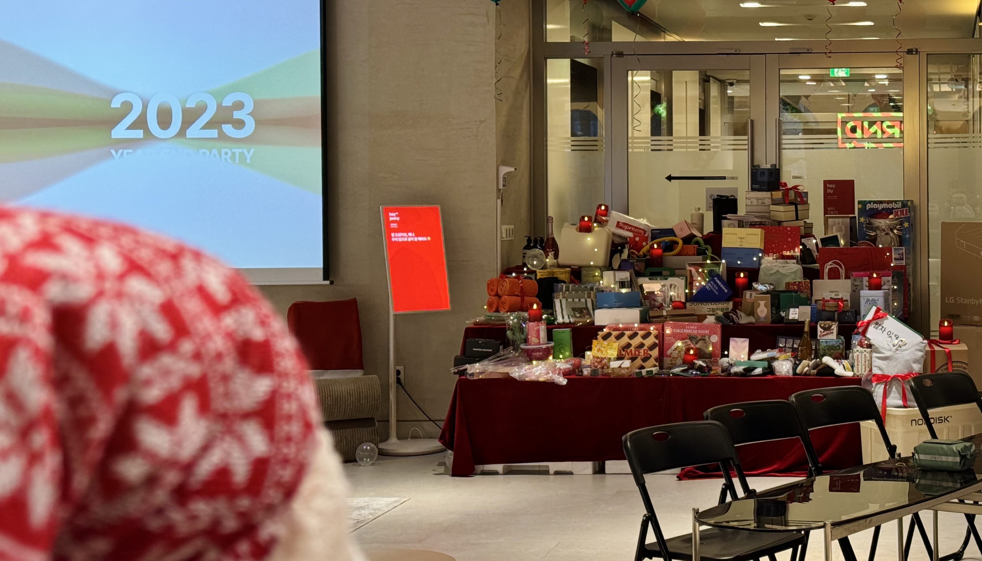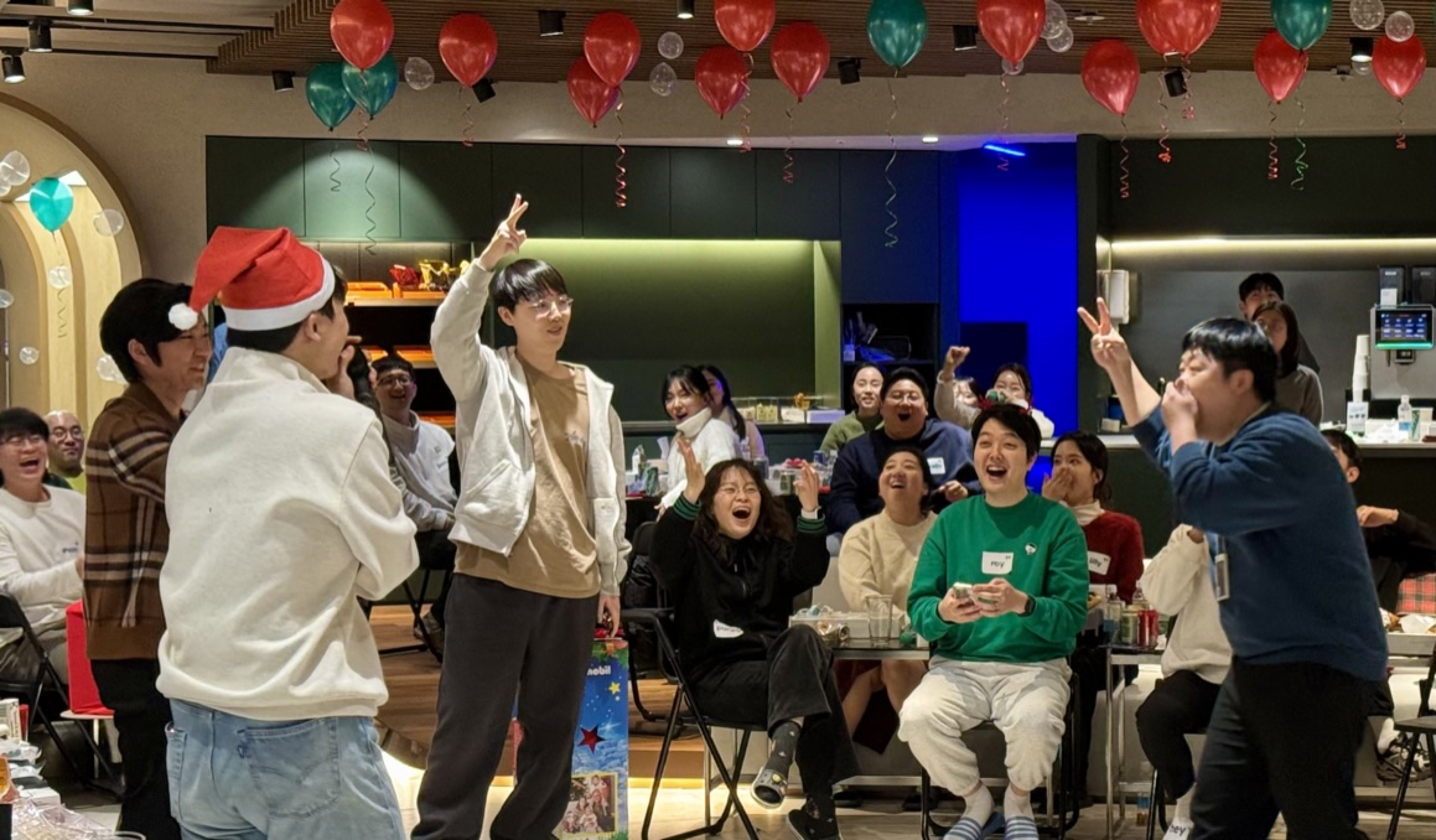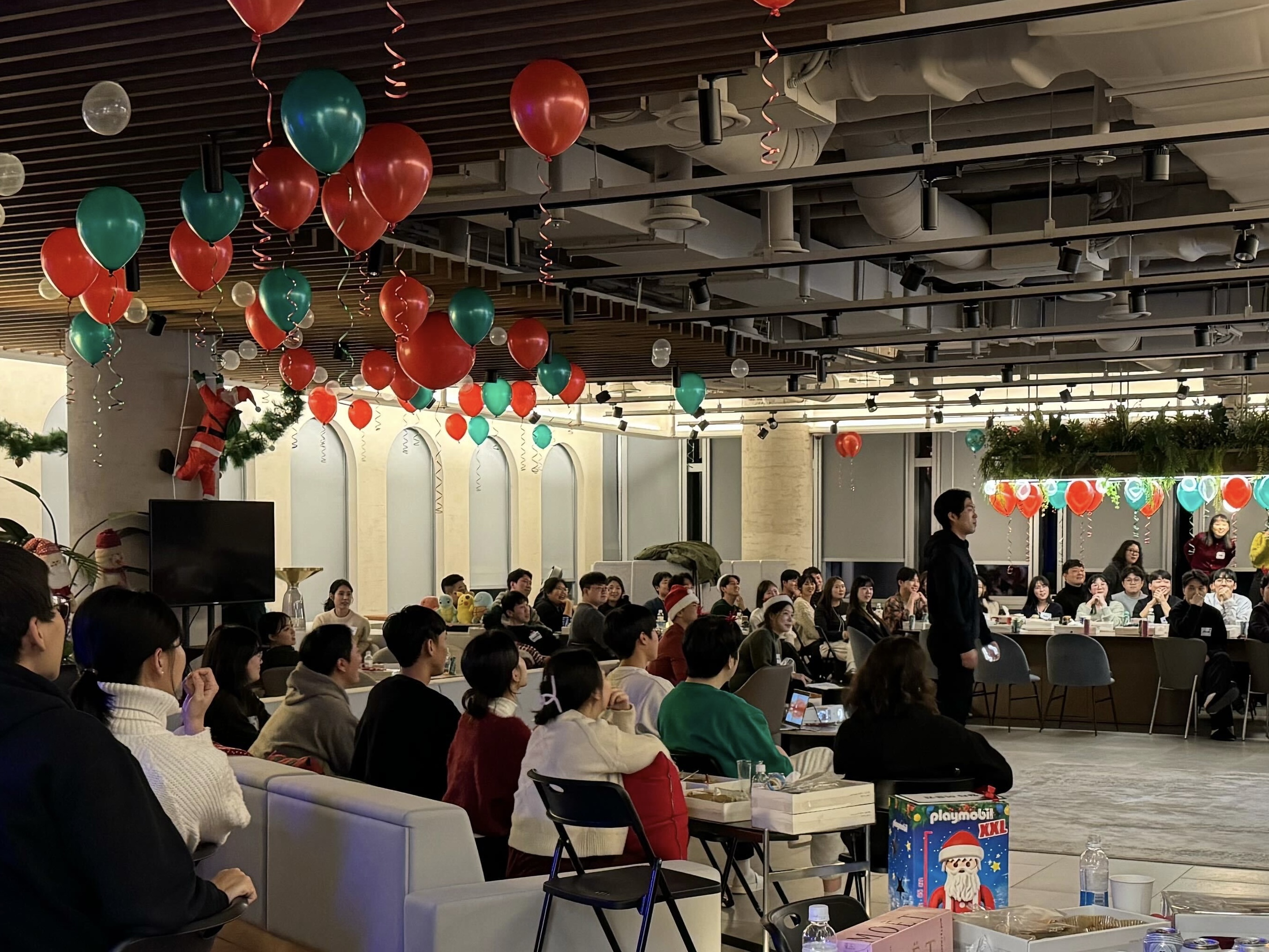 겨울 시즌에 맞춰 예뻐진 헤이딜러 사무실 라운지가 보이시나요? 결을 맞춰 알록달록한 풍선까지 더해진 송년회 현장을 보니 '진짜 연말' 같은 느낌이 납니다. 싱글벙글해진 표정들은 풍선 때문만은 아닌 것 같은데요, 송년회 시상식과 게임을 통해 받을 수 있는 선물 더미를 보니 마음이 더 부푸는 것 같습니다 🤣