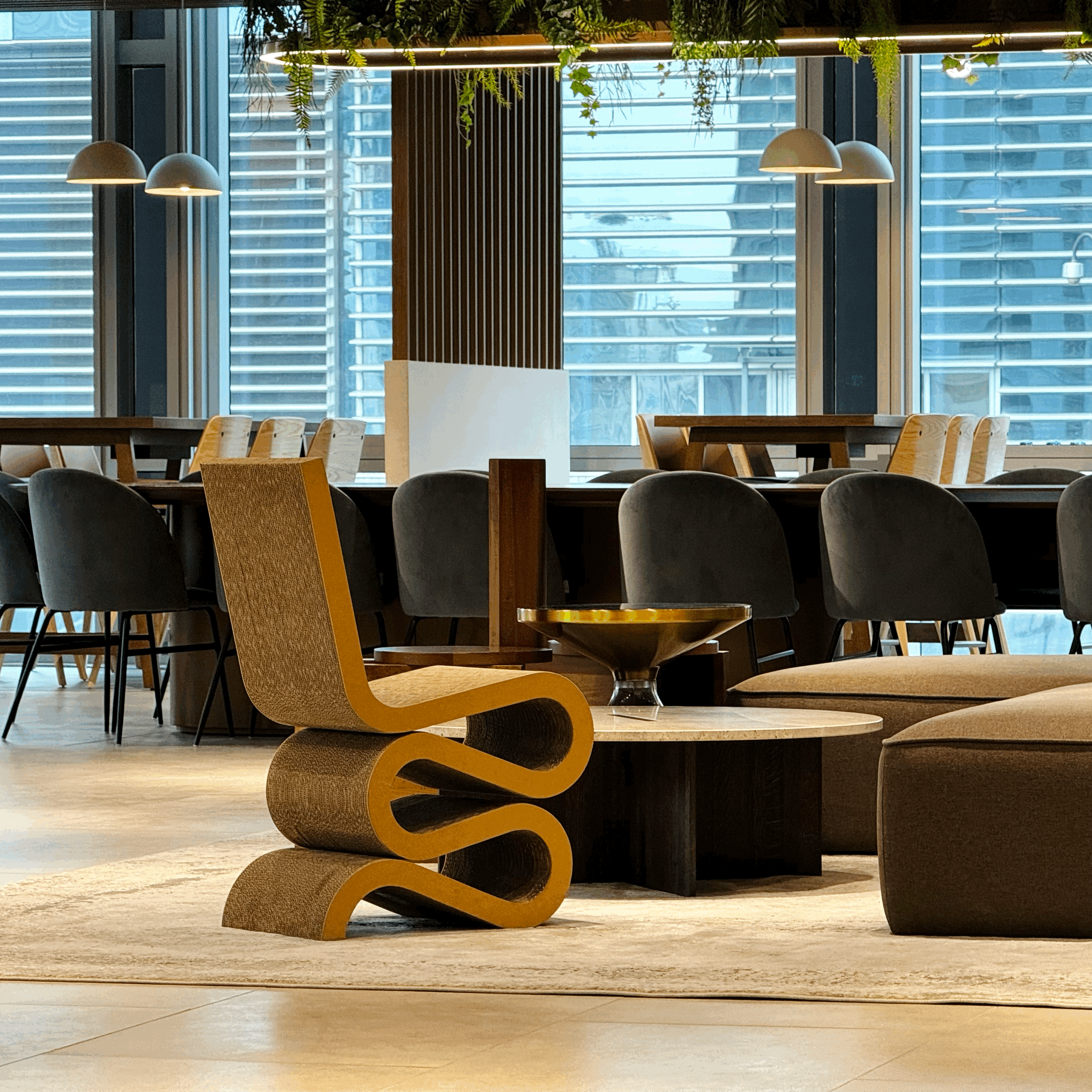 비트라 위글 사이드 체어입니다. 보자마자 라운지 포인트로 딱이다 싶었습니다. 골판지 재질이라 어쩌다 보니 컬러도 웜톤(?)이었구요. 단순한 형태를 가진 주변 가구들과의 조합에서도, 환기를 시켜줄 수 있는 요소겠다 확신했습니다 🙃