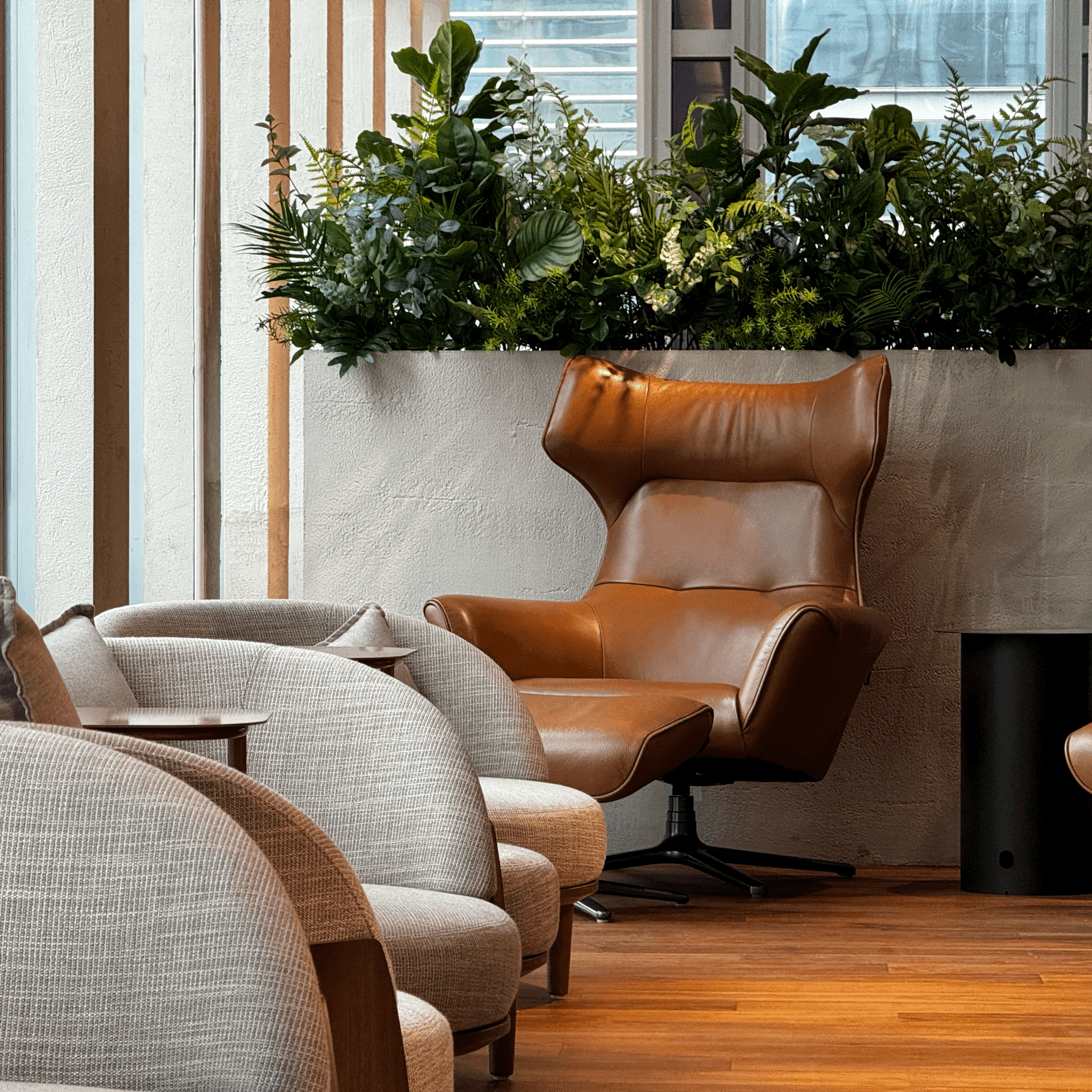 발길이 뜸한 라운지 구석에는 1인용 소파를 두었더니, 지나다니는 사람이 적어 오히려 좋은 자리가 되었습니다. 이 자리보다 더 독립된 공간이 필요하다면 포커스룸을 1인 사무실처럼 이용할 수 있어요.