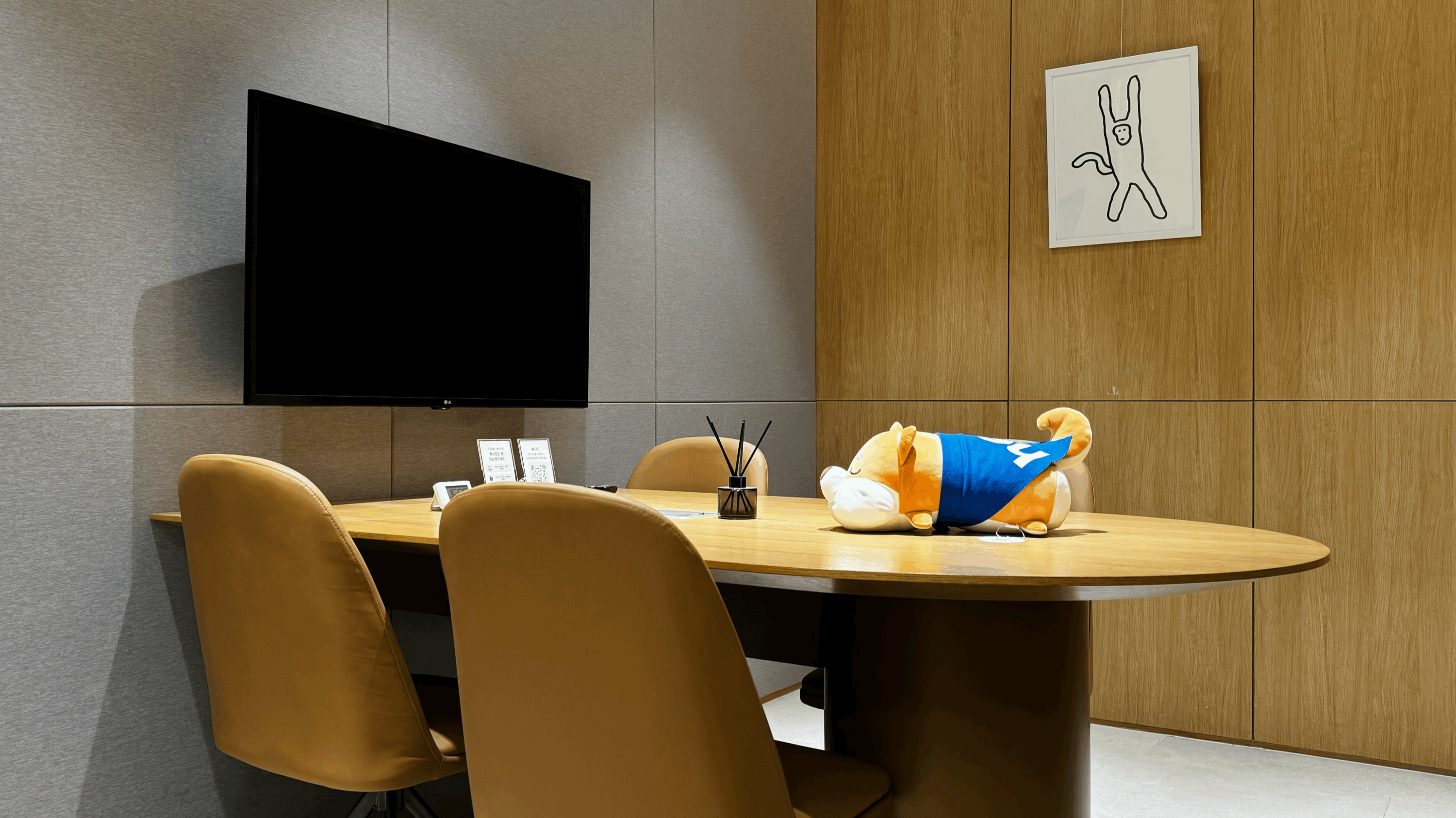 긴장감을 조금이라도 풀어드리고자, 말랑한 인형과 귀여운 액자, 편안한 향이 나는 디퓨저를 비치했어요. 그리고 외부 소음을 일부 차단해 주는 백색 소음기도 설치해서, 조금 더 차분한 공간이 되었습니다. 실제로 인형이 있어서 도움이 되었다는 지원자분도 계셨는데요 🐶 혹시 면접 일정을 기다리시는 지원자분께서 이 블로그를 보고 계신다면, 오셨을 때 먼저 인형을 만져보시는 것을 추천합니다 😆 (저도 만져봤는데, 심신이 3초 만에 안정되더라고요!)