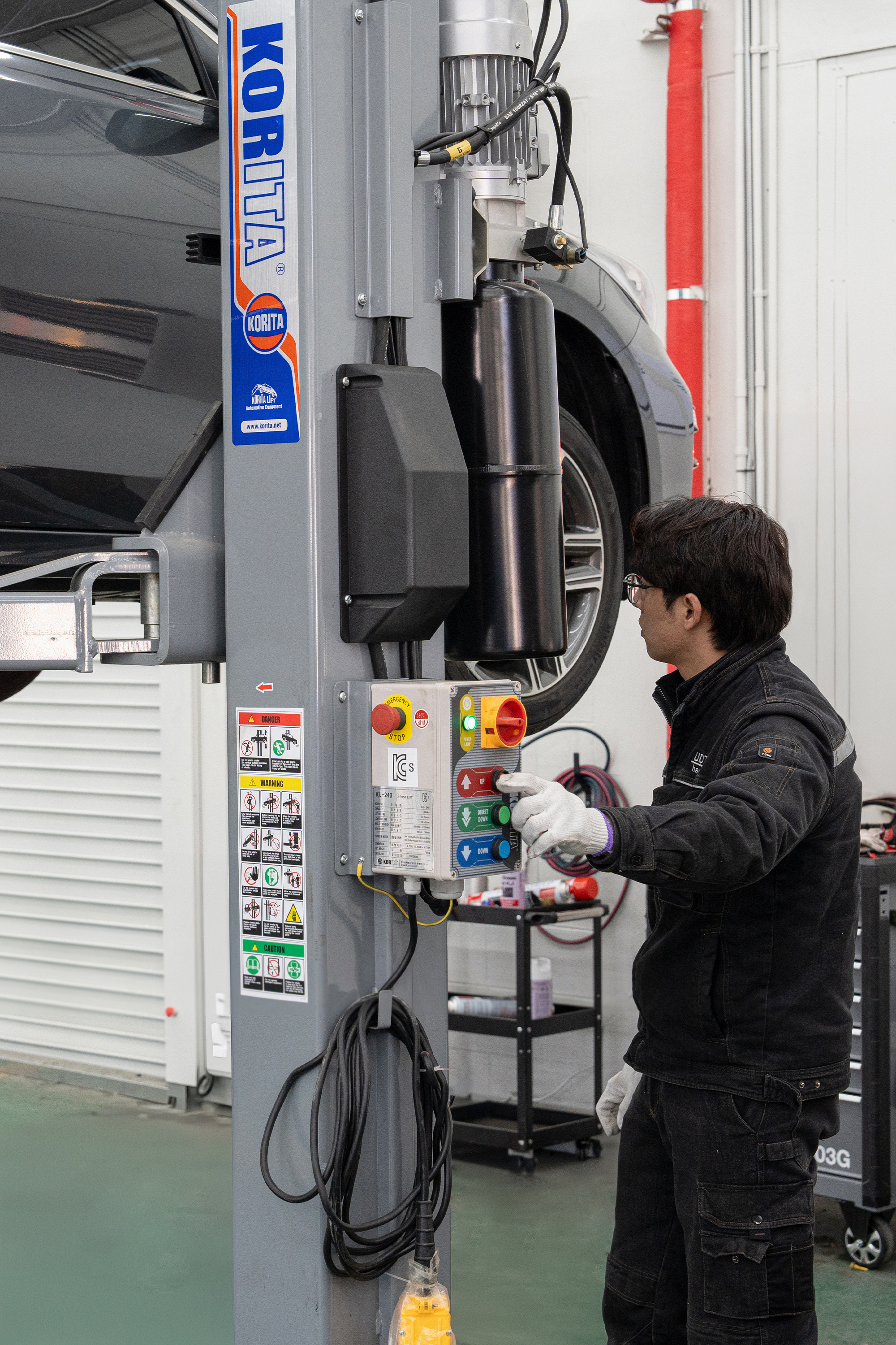 UDTT 정비소에 오시면 생각보다 큰 규모에 놀라실 것 같아요. 4주식 리프트 5대와 2주식 리프트 20대가 함께 돌아가고 있고, 하루에 평균 약 100대의 차량을 정비하고 있습니다.